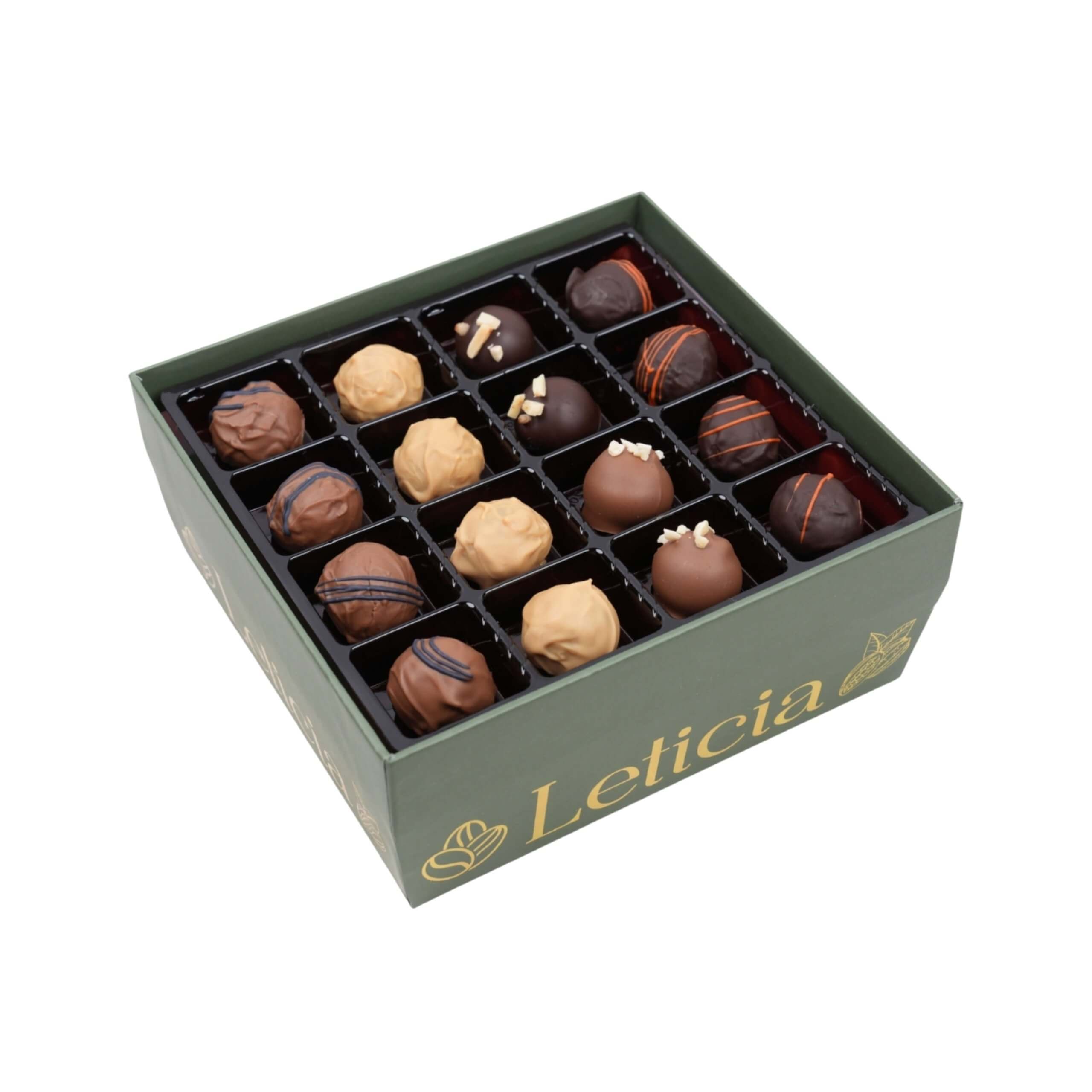 Leticia’nın yeşil-gold tasarımlı özel kutusu, ürünü görsel olarak da premium bir hediye alternatifi haline getirir. Kahve yanında ikramlık olarak, özel günlerde zarif bir armağan veya butik tatlı deneyimi arayanlar için ideal bir seçimdir. Kutunun iç düzeni her trüfü ayrı bölmede sunarak tazeliği ve form bütünlüğünü korur.