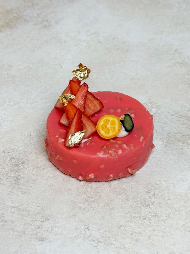 STRAWBERRY CAKE, çilek dolgusu, çilekli mousse, vanilyalı kek ve çilekli crunch sos katmanlarıyla hazırlanan ferah ve modern bir fine pastry yorumudur.